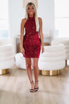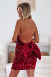 Take your simple mini dress to the next level with this halter velvet sequin dress  with a large removable bow on the back.