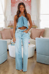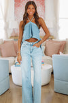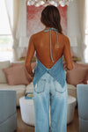 How cute is this denim crop top? We love the stitching details and the single button in back.