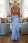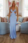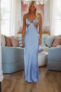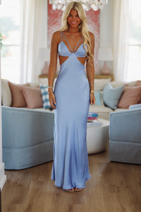Turn heads in the All Eyes on Her Maxi Dress in blue. This satin-style gown features playful tie details and flirty cut outs, making it perfect for sorority formals or any special night out. Feel confident and stylish as you dance the night away in this effortlessly chic dress.