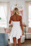This strapless mini dress has lace and ribbon detailing. We love the handkerchief hem.