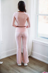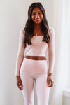 This ballet inspired long sleeve athletic crop top has a square neckline and removable padding.