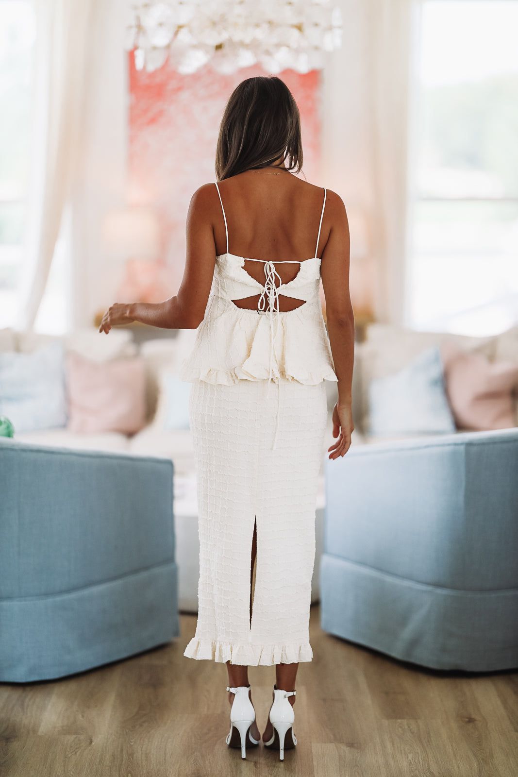 This set is so cute! We love the textured babydoll style crop top and matching skirt.