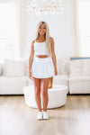 We love the tiny blue roses on this tennis skort. It has a ruffled skirt with shorts under it. It is so cute to wear with the matching crop top we also sell.