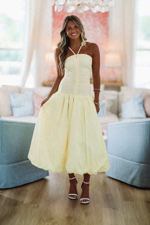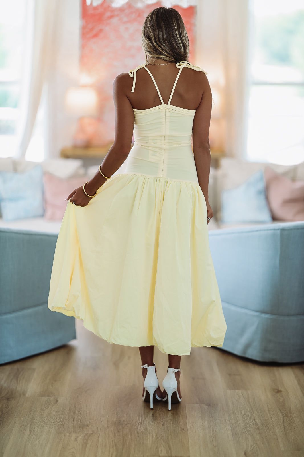 A vibrant midi dress. The drawstring ties give a slight ruching effect on the stretch bodice. The bubble skirt is fully lined.
