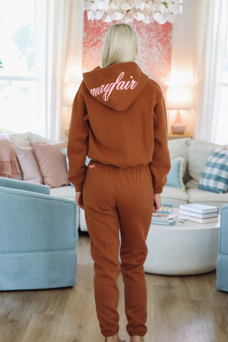 '"Cancelled Plans" and taking a me day' printed with puff print in pink across center front. 'Mayfair' printed in puff print in pink on center hood . It's time to full your cup ♥' screen printed in pink on right wrist