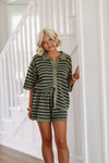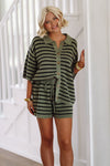 This fun knit shorts has a tie at the top, elastic and cute stripe details.