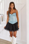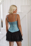 Did someone say trendy? We love the denim and fabric mix on this mini. The lace trim is so cute!