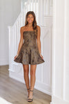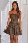 We love this strapless flared mini skirt and the soft, floral vegan suede material.