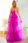 This ball gown has a tiered ruffle skirt is stunning! Perfect for formals or prom. This is a great floor length dress option.