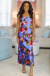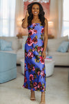 This stunning floral print maxi dress has a satin feel and tube top cut that is so trendy