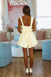 This sleeveless poplin romper has shoulder bows and tie back detail.