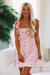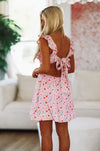 This is a perfect summer mini dress. We love the ruffled shoulder straps and the back tie and cutout.
