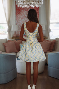 This lemon print mini has a lace up detail in the back.
