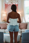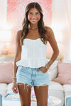 This is the perfect strapless corset style top. We love the ruffled hem and there is smocking in the back. Such a fun peplum style!
