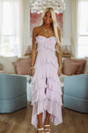 This chiffon maxi has rows of ruffles and a padded bodice.