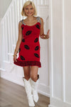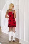 We love this football printed knit mini dress with gingham ribbon straps and a stripe ruffle along the bottom edge! Such a cute game day look!