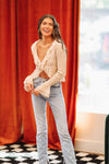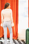 We love this frill detail long sleeve knit top with ruffles and a self tie in the middle!