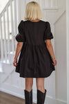 We love the bow detail on this poplin mini dress with puff sleeves.
