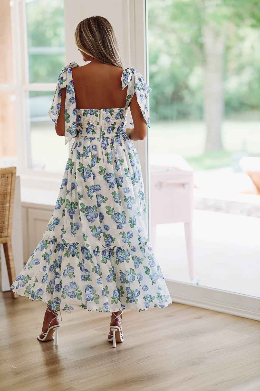 This maxi dress is the perfect combination of girly and chic. The structured bodice gives it a polished look while the slowy ruffle skirt adds a feminine touch. To complete this look, there are bow self tie straps for an extra bit of flair and a beautiful floral print that will make you stand out in any crowd!