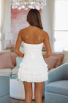 This strapless mini dress has lace ruffle details and is so comfy and stretchy