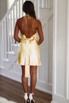 This mini!! This halter neck mini has a cute back tie detail. We love the vibrant lemon yellow color and satin feel fabric.