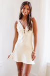 Brighten your day in the Good Graces Mini Dress – Yellow, featuring a flirty V-shaped neckline adorned with delicate lace detailing. This playful touch adds charm while keeping the look effortlessly chic and fun for any sunny occasion.