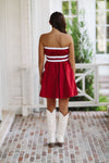 This cute strapless mini has contrasting elastic along the bodice and pockets. Perfect for gameday!