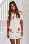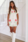 This button down knit romper is embroidered with a cute floral design.