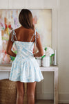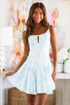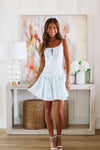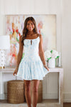 This corset style mini dress has adjustable shoulder ties and a cute lace trim detail.