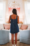 This square neck flare denim mini has great stitching details.