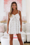 How cute is this mini dress? We love the bow detail and the classic ivory and dark taupe floral pattern.