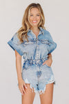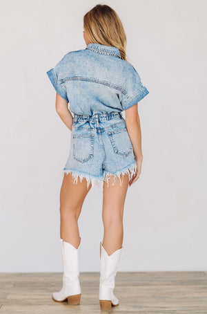 Just so you know, you won't want to miss out on this acid washed denim romper! It's a modern take on an 80's trend.  This button up denim romper has an elastic waist, frayed bottoms and cuffed sleeves.  Trip to Nashville booked---check!  Denim Romper in your cart---check!  Best concert look of the season---check!