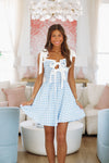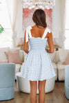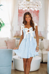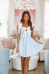 This cute little mini dress has a cute plaid gingham print and smocked top with self tie shoulder straps and bows in the middle of the bust.