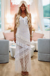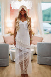 We love this ruffle floral print and lace maxi dress!