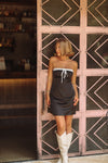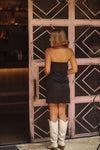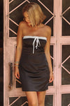 This black satin mini dress is beyond cute! We love the subtle lace trim detailing and cute flattering cut.