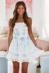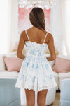 It has a corset style top with clasp down the center. A drop waist with ruffles on the bottom and adjustable straps.