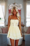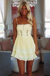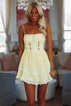 It has a corset style top with clasp down the center. A drop waist with ruffles on the bottom and adjustable straps.