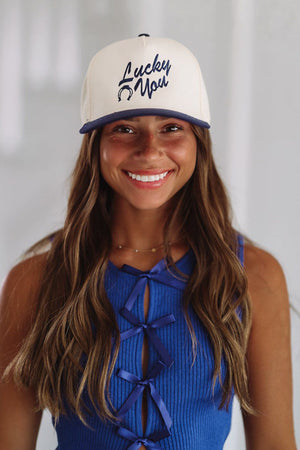 Lucky You Two Toned Snapback Hat - Beige and Navy