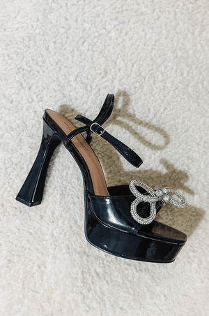 These platform heels have the cutest rhinestone lace up straps and rhinestone bow on the top! We love this trendy open toe designer dupe style!