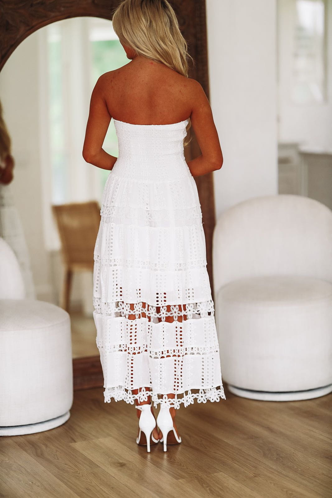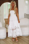 This eyelet lace midi dress is stunning! We love the layered ruffle details and ruching on the top!