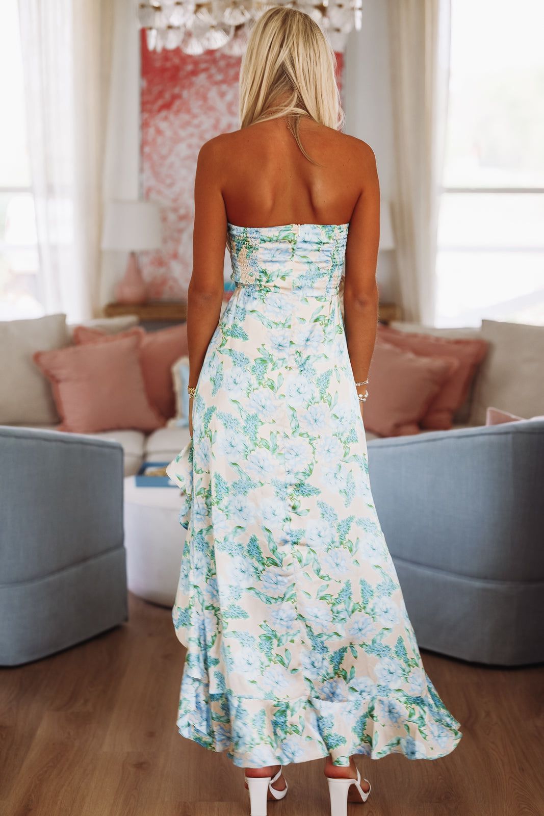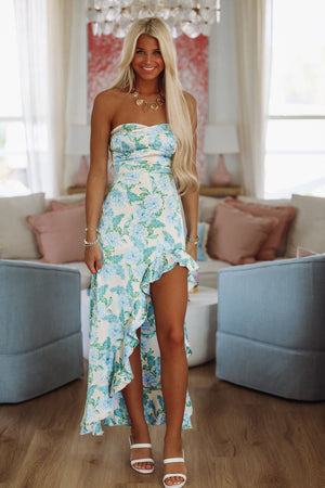 This floral print maxi has an asymmetrical ruffled hem.