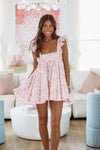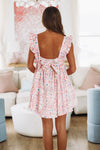 This floral mini dress has ruffled straps and a cute bow detail.