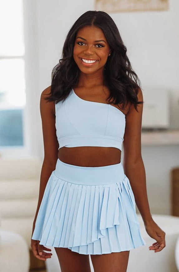 You will crush the gym in this one shoulder, asymmetrical cut sports bra! Wear with leggings or match with our Crosscourt Tennis Skirt!
