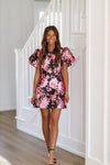 How cute is this mini dress! We love the metallic floral jacquard fabric and shimmer of the material. The short sleeves with a subtle puff are so trendy.