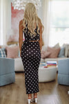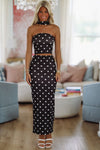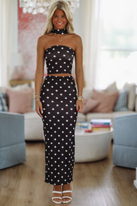 Step out in style with this playful two-piece set featuring a black polka dot maxi skirt and a matching crop top with a chic necktie. The flowing skirt adds effortless elegance, while the crop top brings a flirty touch perfect for sunny days or evening fun. Mix and match or wear together for a bold, coordinated look that’s sure to turn heads.
