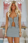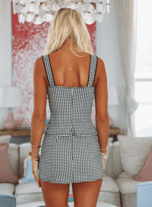 This gingham top has cute lace details. It goes perfectly with the Right on Beat Skort we also sell.