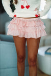 This mini skort has ruffles and lace for a sweet, feminine look.
