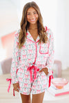 We love this satin comfy pajamas! The santa print, the soft fabric, the velvet bow details are all adorable!