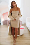 This boucle knit sleeveless mini dress comes with a long cardigan.