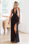 This maxi dress is stunning with its open back, fringe details and cute cut out!